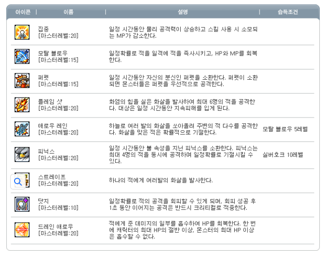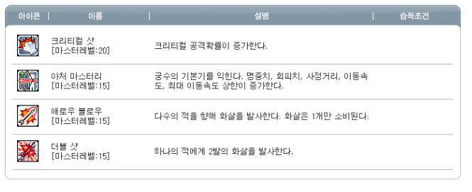 2차 전직 후엔 사용하는 무기에 특화된 스킬을 배움으로써 진정한 궁수의 모습을 갖추게 됩니다.