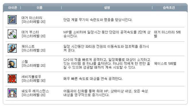 주요 스킬 : 대거 마스터리, 대거 부스터, 헤이스트, 세비지블로우, 스틸, 인듀어