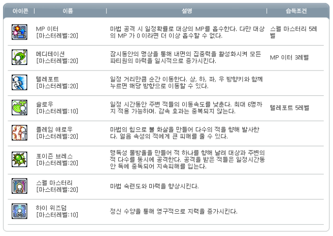 주요 스킬 : 텔레포트, MP 이터, 메디테이션, 파이어 애로우, 포이즌 브레스