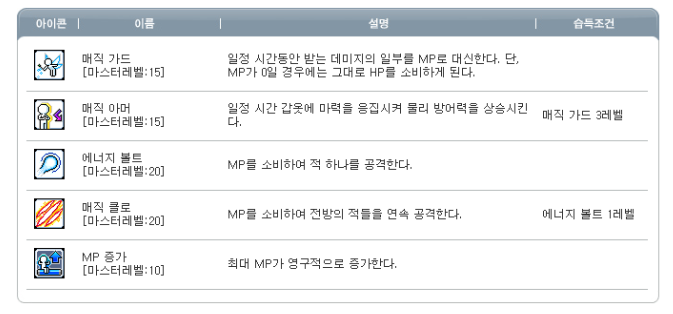 주요 스킬 : 매직 클로, MP회복력 향상, MP회복력 향상, 매직가드 M