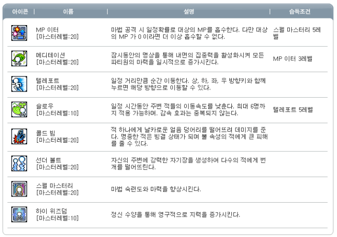 텔레포트 1 >> 썬더볼트 30 >> MP 이터 20 >> 텔레포트 20 >> 메디테이션 20 >> 콜드 빔 30 >> 자유분배