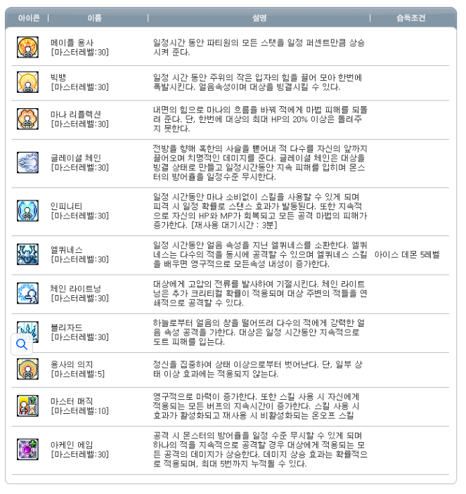 주요 스킬 : 블리자드, 체인 라이트닝, 메이플 용사, 이프리트, 용사의 의지, 아이스 데몬