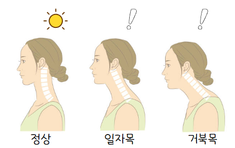 - 일자목은 목뼈의 C자 곡선이 사라진 상태이고, 거북목은 목이 앞으로 나와 어깨와 균형이 맞지 않는 상태입니다.